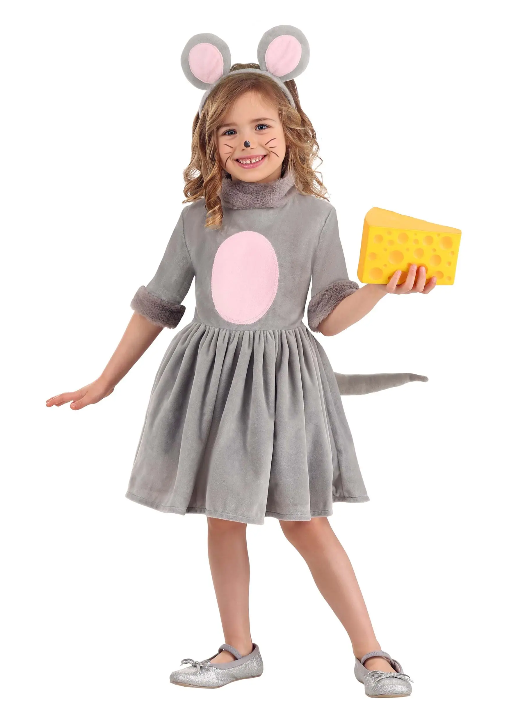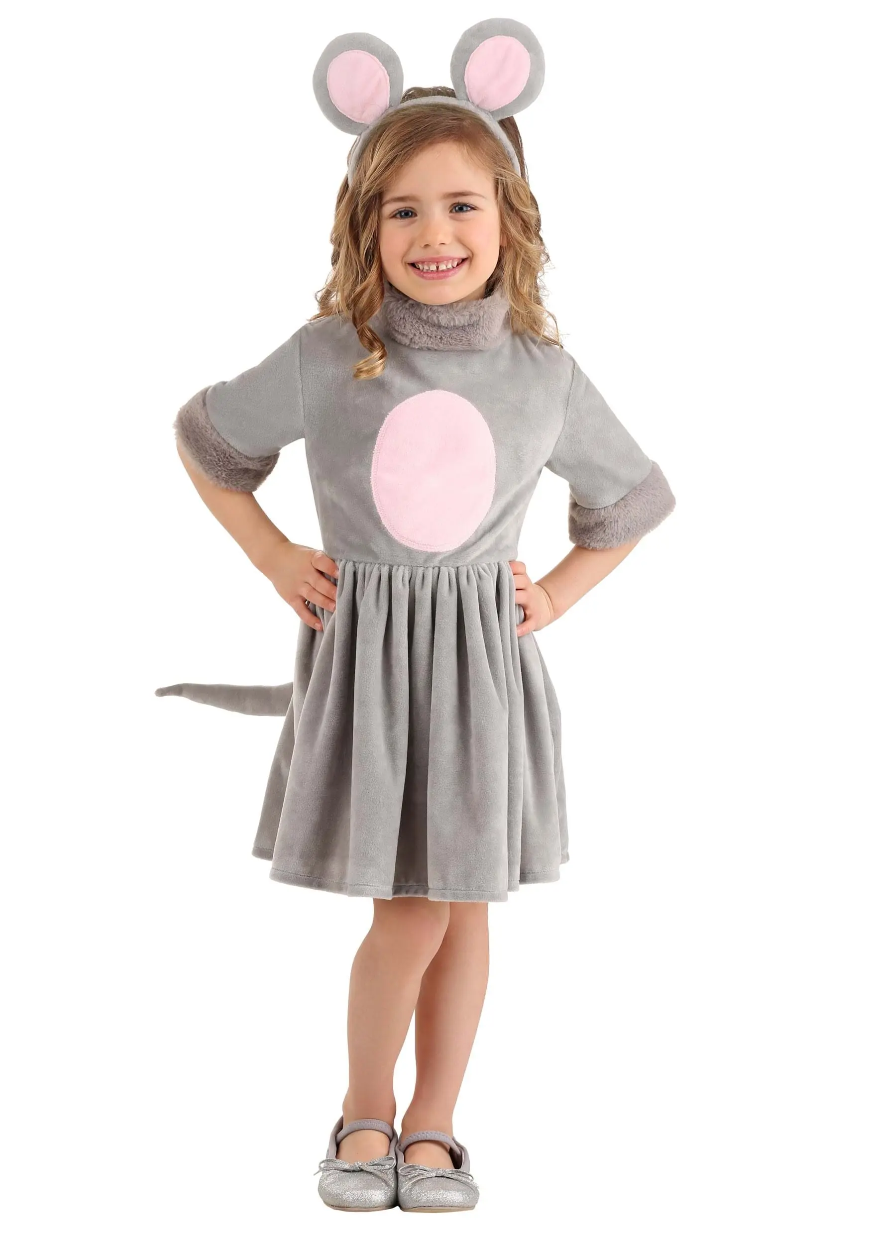 We designed this Mouse Dress Costume for Toddlers to help your child be the coolest mouse on the block (of cheese)! The dress is made of a soft plush material to imitate the fur of a real mouse and help your child stay warm while wearing it. It features a light pink tummy panel and faux fur around the sleeve cuffs and neckline. It even has a tail on the back that attaches with a hook and loop fastener, so it doesn’t get in the way of the zipper. You can’t be a mouse without cute ears! This costume includes a headband with ears and a gray and pink polka dot bow to tie everything together. Draw on some whiskers, add your child’s favorite pair of shoes, and they’ll be ready to sniff out the best snacks at every door!