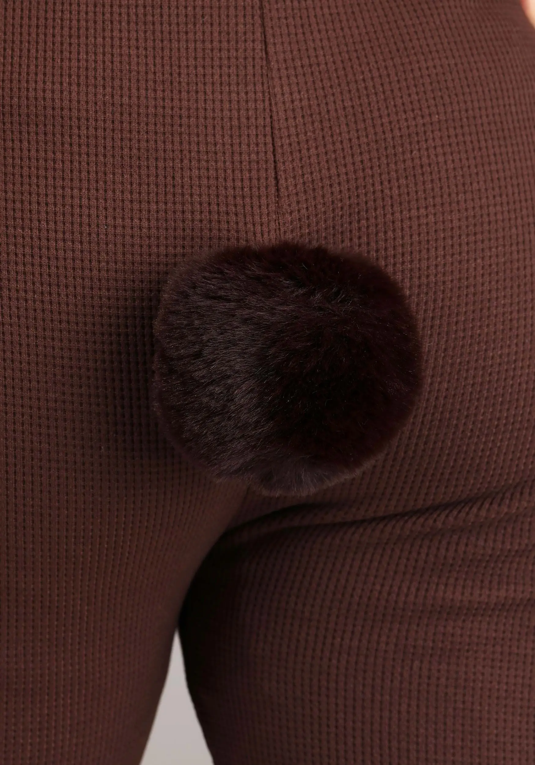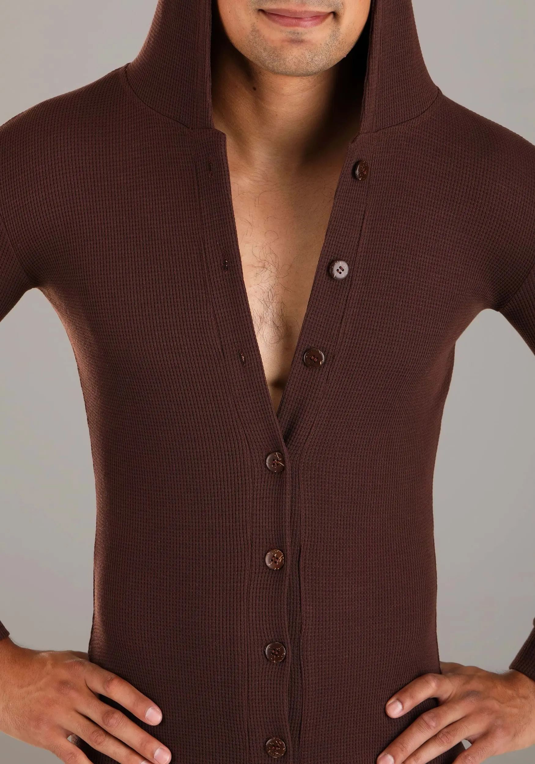 Unleash your inner animal when you wear this exclusive Sexy Bear Costume for Men! The one-piece jumpsuit-style outfit is made of knitted brown thermal waffle fabric that’s so soft and snuggly that everyone will want you to give them a bear hug. Use this superpower carefully. Its form-fitting design will show you off in the best possible way, while the rib knit material on the wrist cuffs and ankles will keep you toasty warm. An attached faux fur tail on the jumpsuit’s seat adds a flirty touch, while the attached hood with bear ears brings the cuteness factor up several notches. Honestly, you’ll break the cuteness meter when the hood is on your head.Â