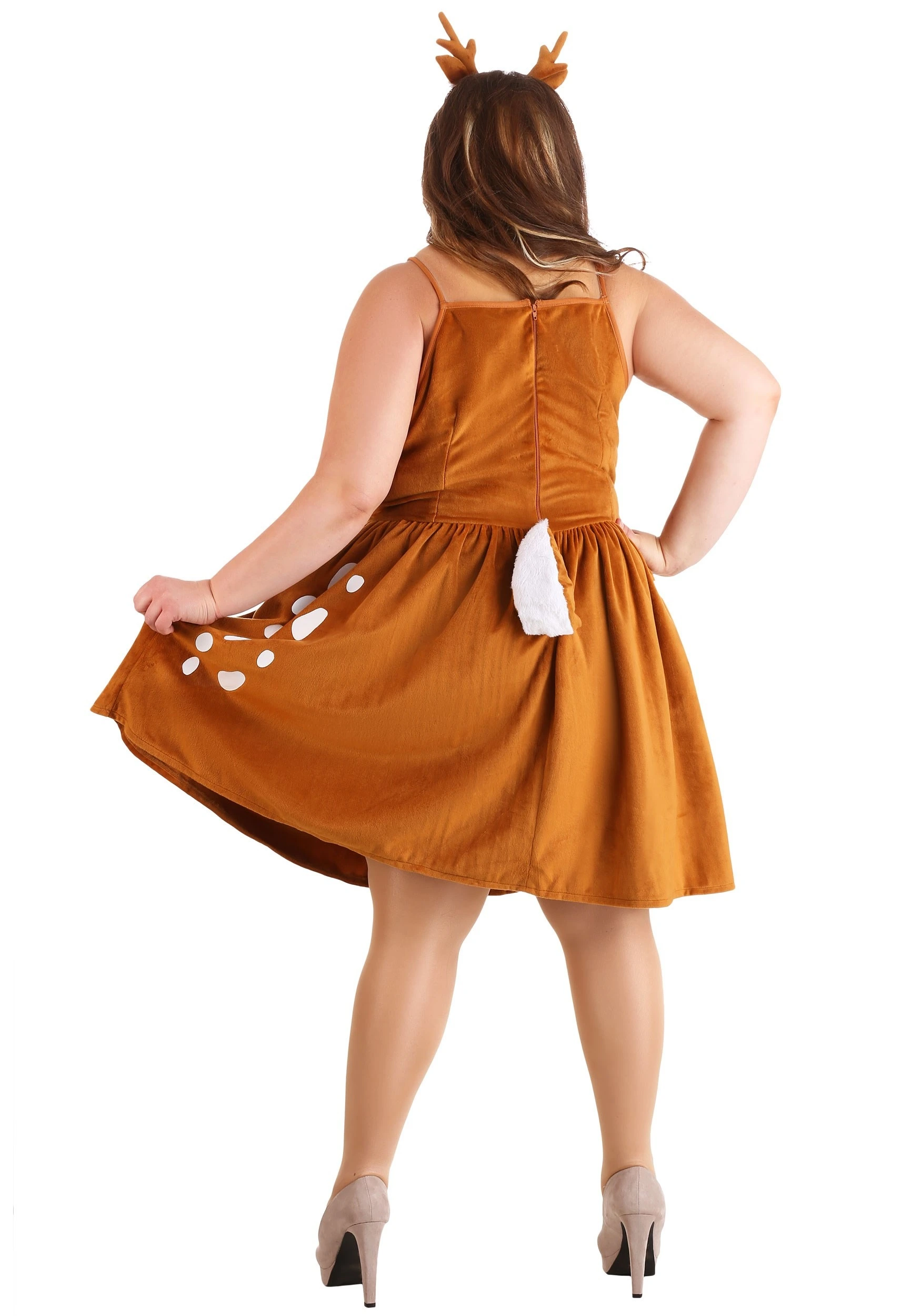 Tawny and soft, you’ll love zipping into this Made by Us look. The top has a white bodice and skinny straps. Designed by our in-house creative team, this dress zips up right above the whitetail. The skirt has fawn-like dots and pleats around the waist. With plenty of volume, this skirt flairs out when you spin. Topped off with a pair of antlers, this costume is picturesque and perfect for both Halloween costumes and Christmas reindeer options.