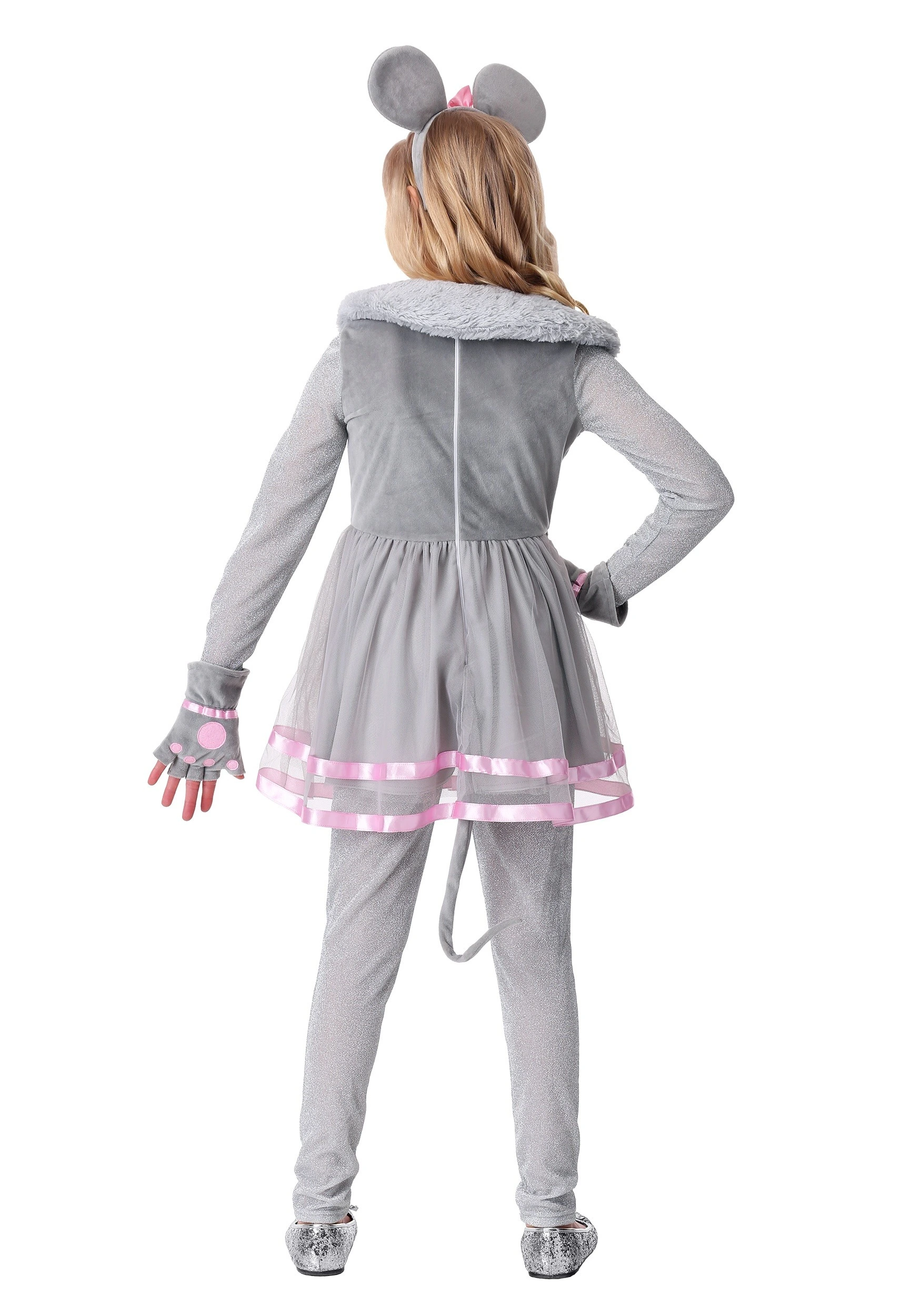 A Made By Us design, our team of designers made sure this costume contained darling details and also included all the mouse-must-have’s needed to become a little gray rodent. The grey skater-style dress features sparkly long-sleeves, a faux-fur collar, a tail in back, a pink bow and a matching double ribbon along the hemline. The included footless leggings are sparkly, matching the sleeves of the dress. The fingerless gloves have interior pink paws to match the mouse-ear headband. The fabric-covered headband is comfortable and completes the ensemble perfectly.