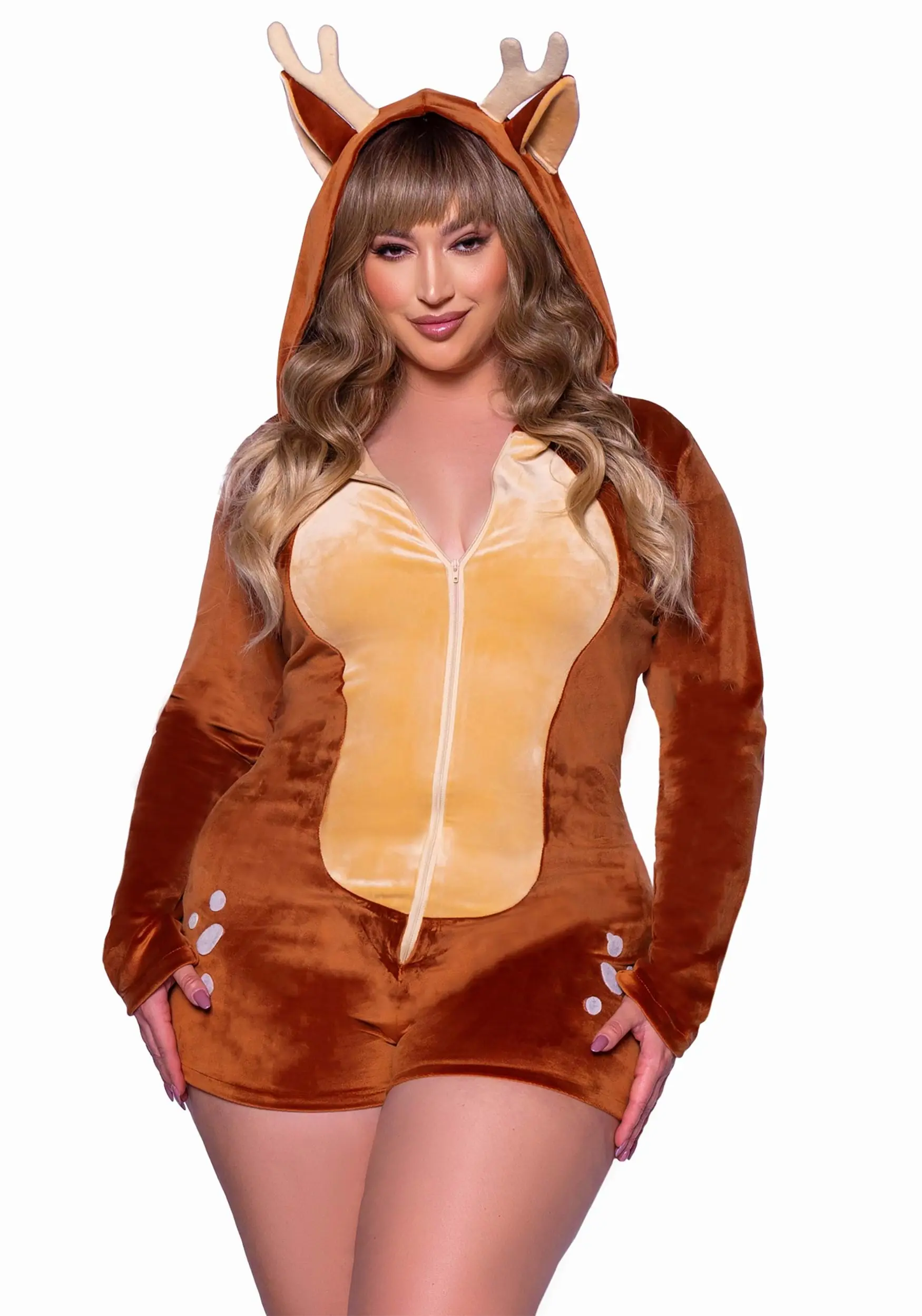 Getting dressed up to go out doesn’t have to be uncomfortable! Stay cozy all evening by adding this Plus Size Sexy Women’s Plush Fawn Romper Costume to your collection. Whether you’re hitting the town and trying to earn a Best Costume prize or staying in and chilling with your herdmates, you’ll never even notice you’re wearing anything at all.